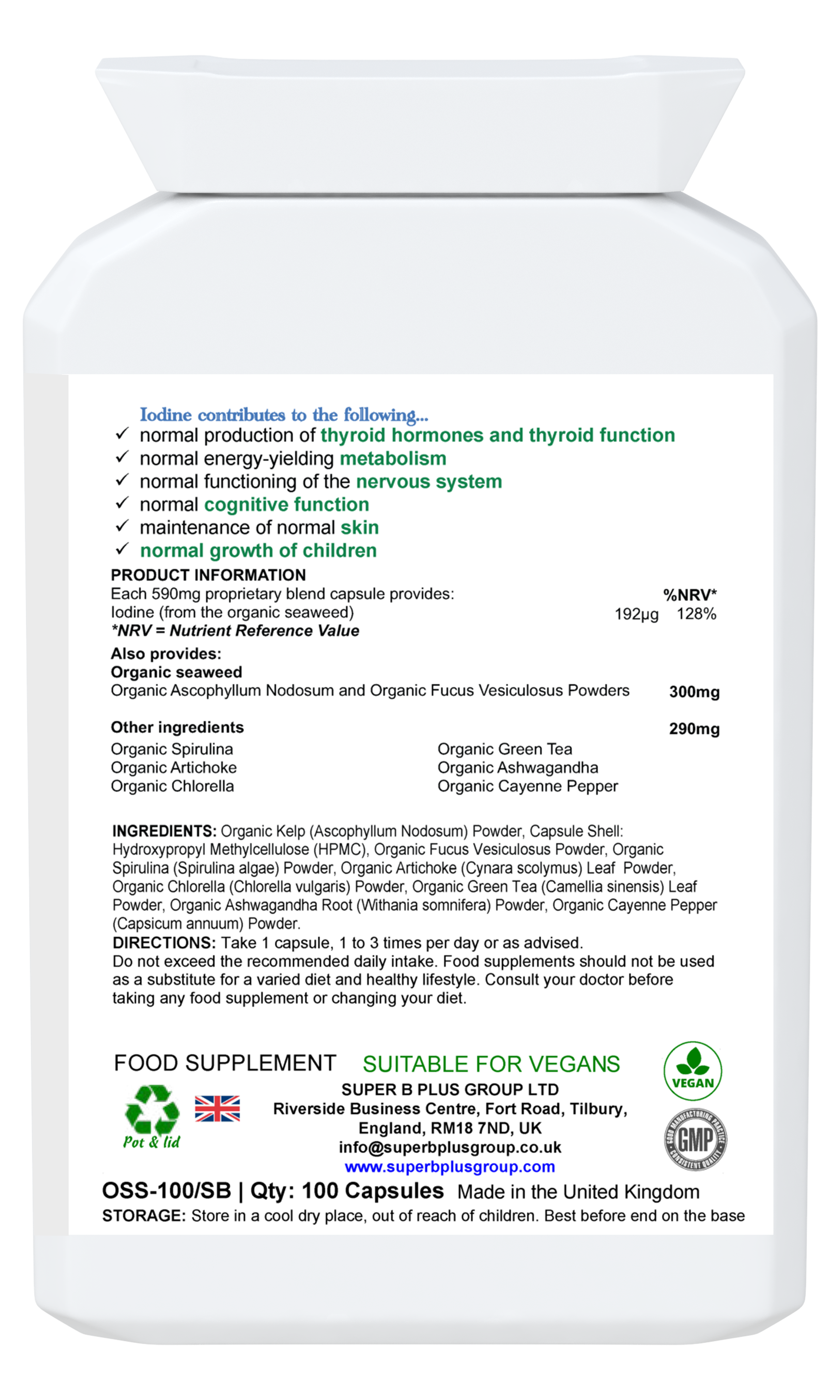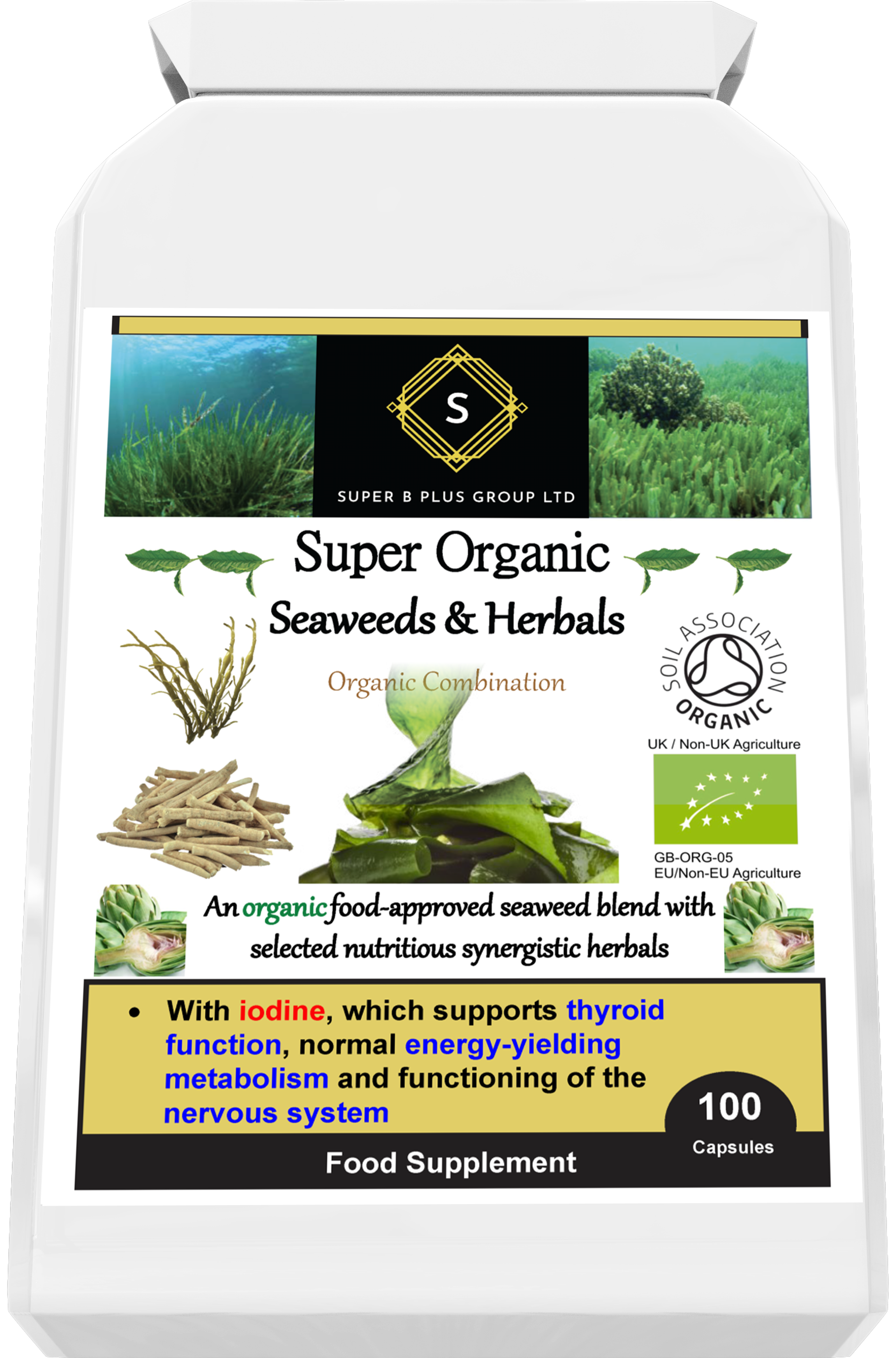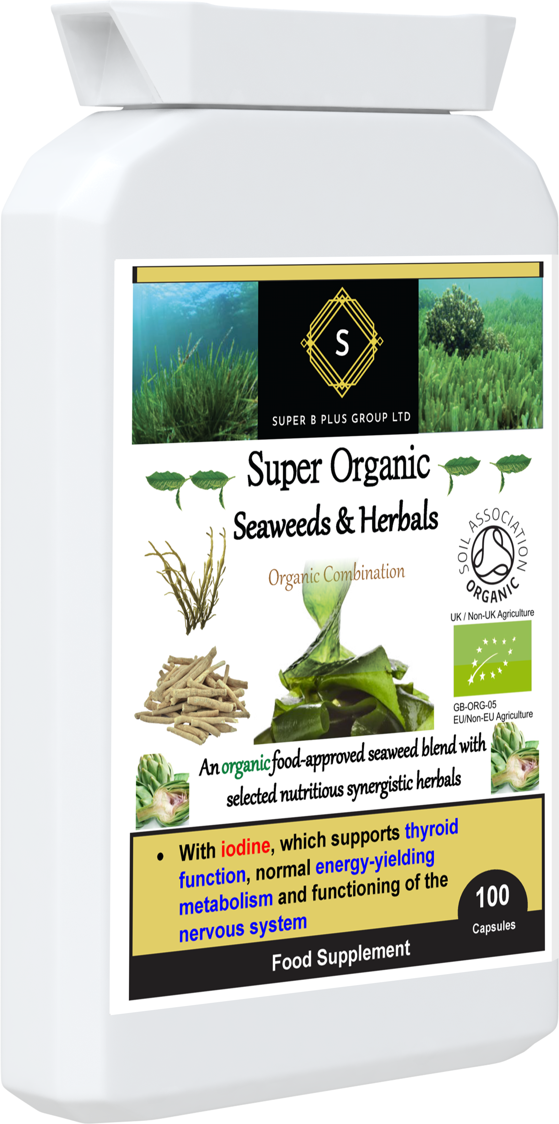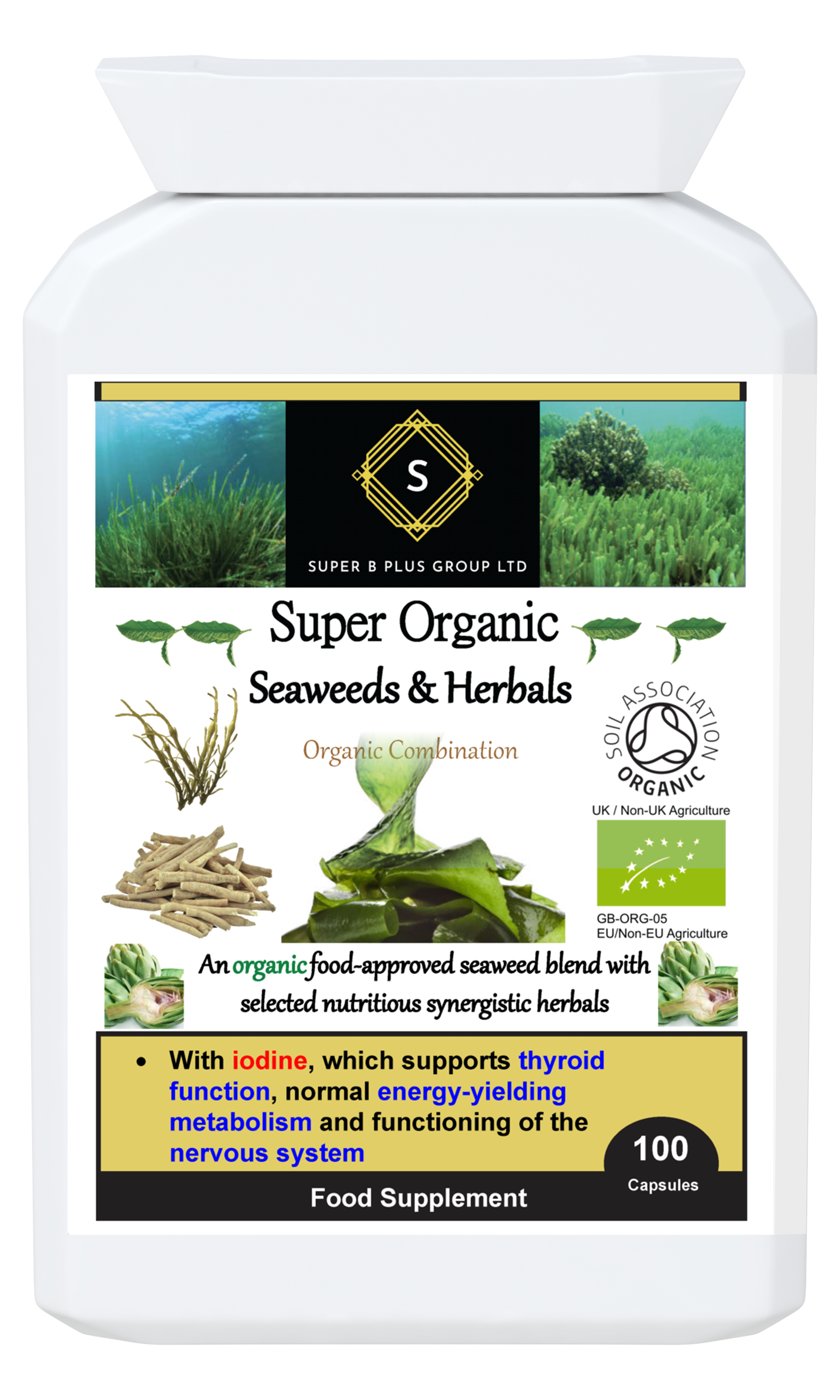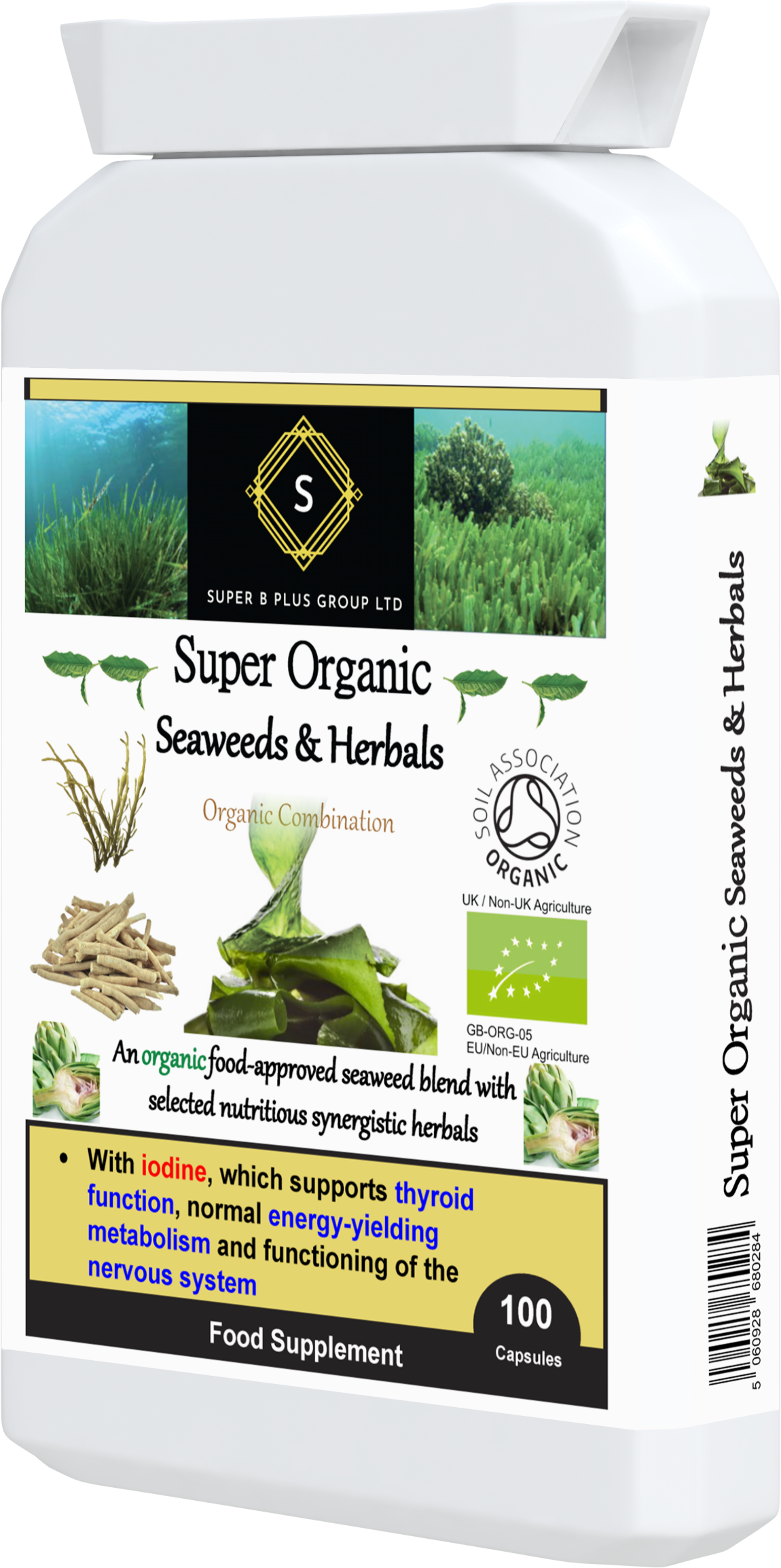 Super Organic Seaweeds & Herbals ofrece una mezcla única de algas marinas ricas en yodo y aprobadas para alimentos (Ascophyllum nodosum y Fucus vesiculosus), con una variedad de vegetales y hierbas: alcachofa, chlorella, hoja de té verde, espirulina, raíz de ashwagandha (Withania somnifera) y cayena.