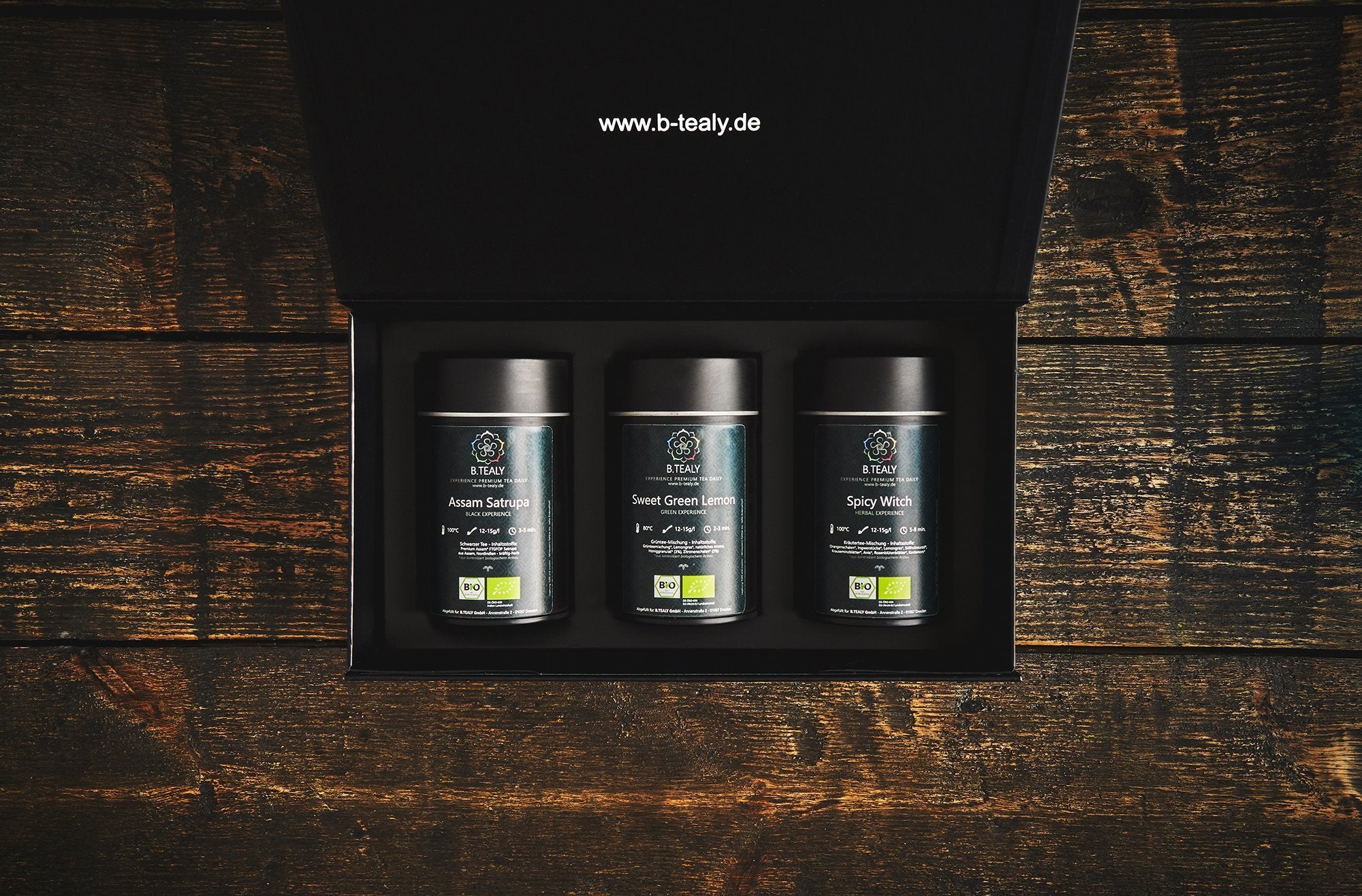 Nuestro té Premium ORGÁNICO se entrega en nuestra elegante caja de té negro hermética a los aromas con una tapa doble y un grabado en la tapa. Nuestro carrito de té es casi completamente reciclable.