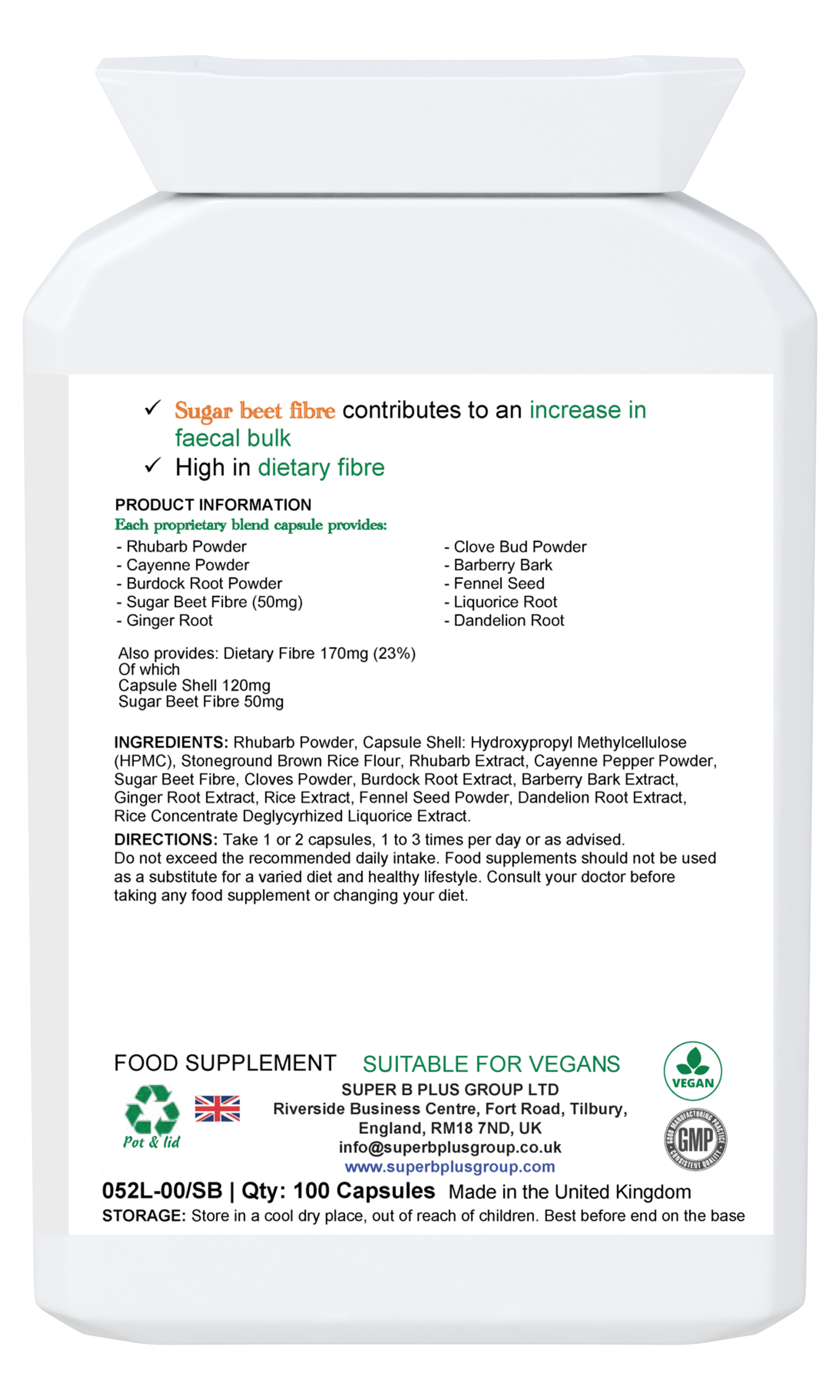 Ingredientes: Polvo de ruibarbo, Cápsula: Hidroxipropilmetilcelulosa (HPMC), Extracto de aloe vera, Polvo de cayena, Polvo de raíz de bardana, Extracto de raíz de ruibarbo, Polvo de fibra de remolacha azucarera, Polvo de brote de clavo, Antiaglomerante: Estearato de magnesio (fuente vegetal), Agracejo Extracto de corteza, polvo de semilla de hinojo, polvo de raíz de regaliz, extracto de raíz de diente de león, extracto de raíz de jengibre.