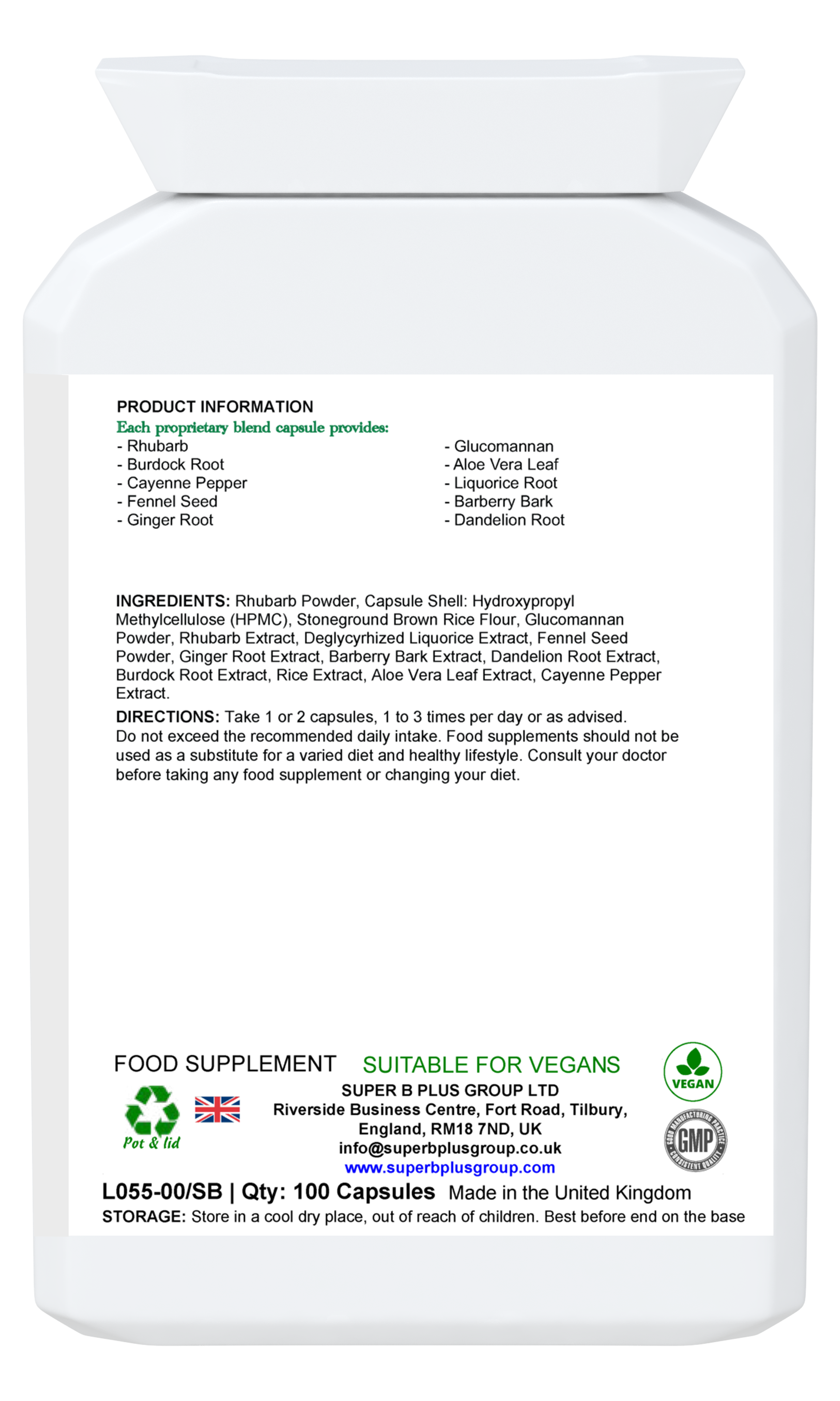 Esta formulación única de ingredientes herbales activos para apoyar la salud del colon combina ruibarbo, raíz de bardana, cayena, semilla de hinojo, raíz de jengibre, glucomanano, aloe vera, raíz de regaliz, agracejo y raíz de diente de león.