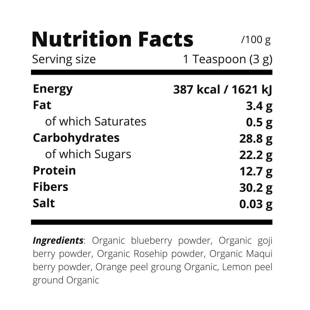El Arándano y el Maqui aportan una importante fuente de antioxidantes mientras que la Cáscara de Naranja y Limón completan la mezcla con fibras y un poder antiinflamatorio.