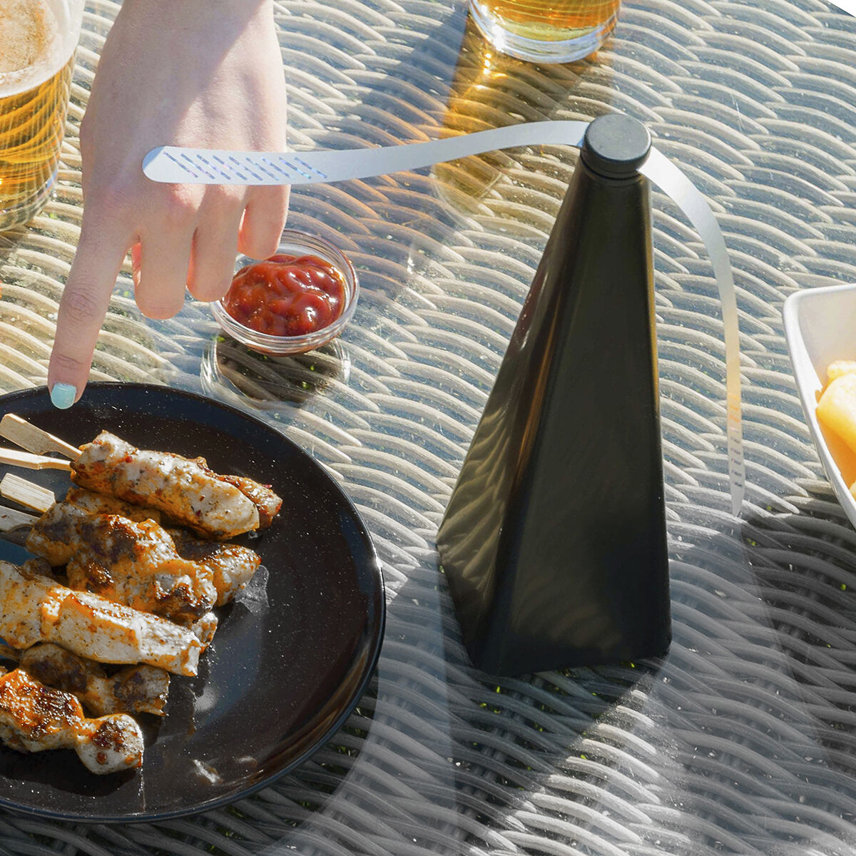 Un original espantamoscas ecológico ideal para espantar a las molestas moscas de forma sencilla, limpia y eficaz. Se puede utilizar en interiores y exteriores, integrándose perfectamente en la decoración por su diseño moderno y elegante. Una de sus grandes ventajas es que es respetuoso con el medio ambiente, ya que no contamina ni resulta perjudicial para la salud al no contener productos químicos ni tóxicos (ecofriendly). Además, es muy silencioso, por lo que su uso no causa ninguna molestia auditiva. Dispone de aspas flexibles con puntos holográficos reflectantes que ahuyentan a las moscas y a otros insectos voladores. Este ahuyentador ecológico es reutilizable, ligero y portátil, ya que funciona con pilas (2 x AA, no incluidas). No necesita cables ni enchufes, por lo que es muy fácil de usar y llevar a cualquier parte donde sea necesario.