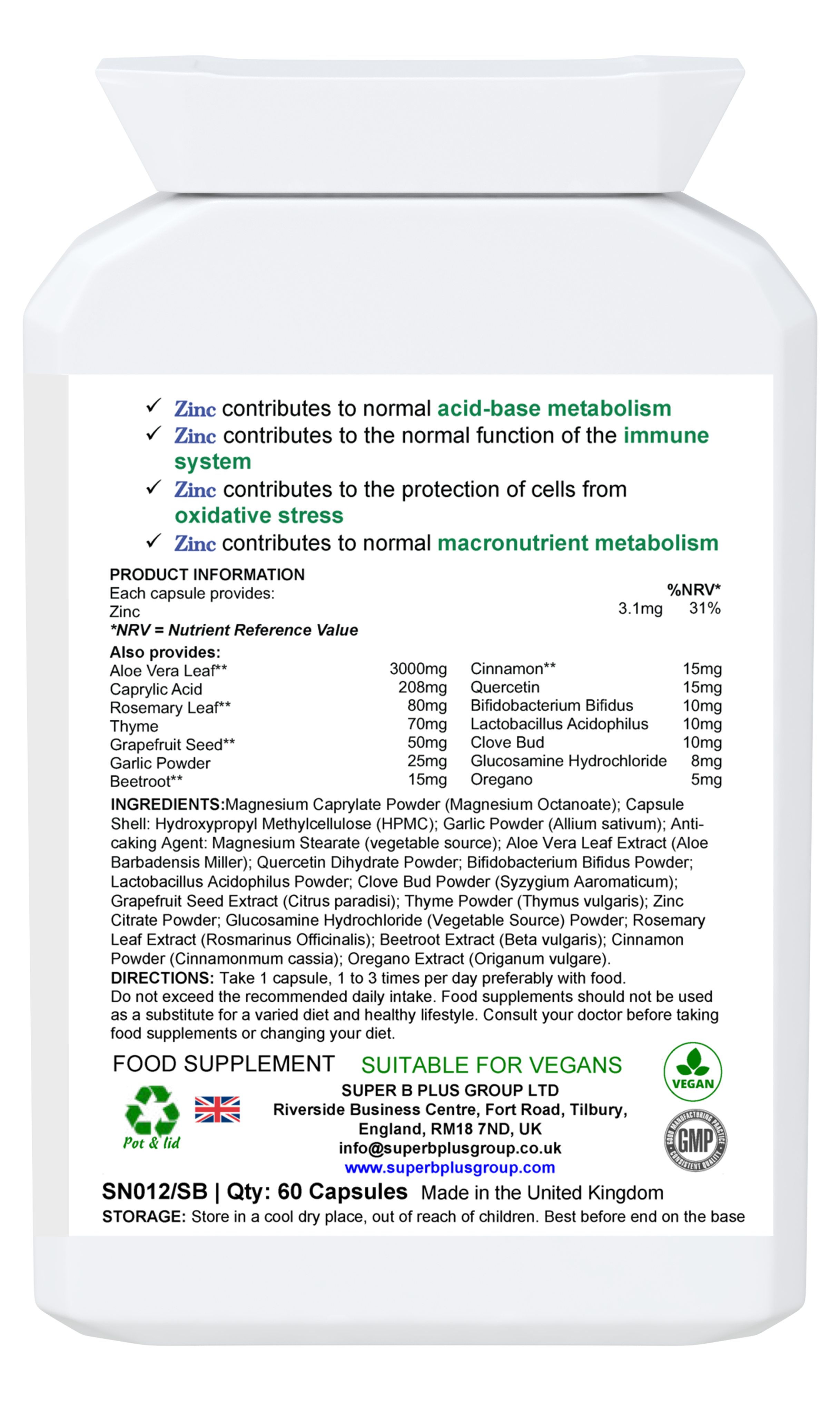 Ingredientes: polvo de caprilato de magnesio; Cubierta de la cápsula vegetariana: hidroxipropilmetilcelulosa (HPMC); Ajo Pdr; Antiaglomerante: estearato de magnesio (fuente vegetal); Extracto de Aloe Vera (200:1); Quercetina Dihidrato Pdr; Bifidobacterium Bifidus Pdr; Lactobacillus Acidophilus Pdr; Clavo Brote Pdr; Extracto de semilla de pomelo (5:1); Tomillo Pdr; citrato de zinc; clorhidrato de glucosamina (fuente vegetal); extracto de hoja de romero (10:1); Extracto de Remolacha (5:1); Canela Ext (5:1); Extracto de orégano (4:1).