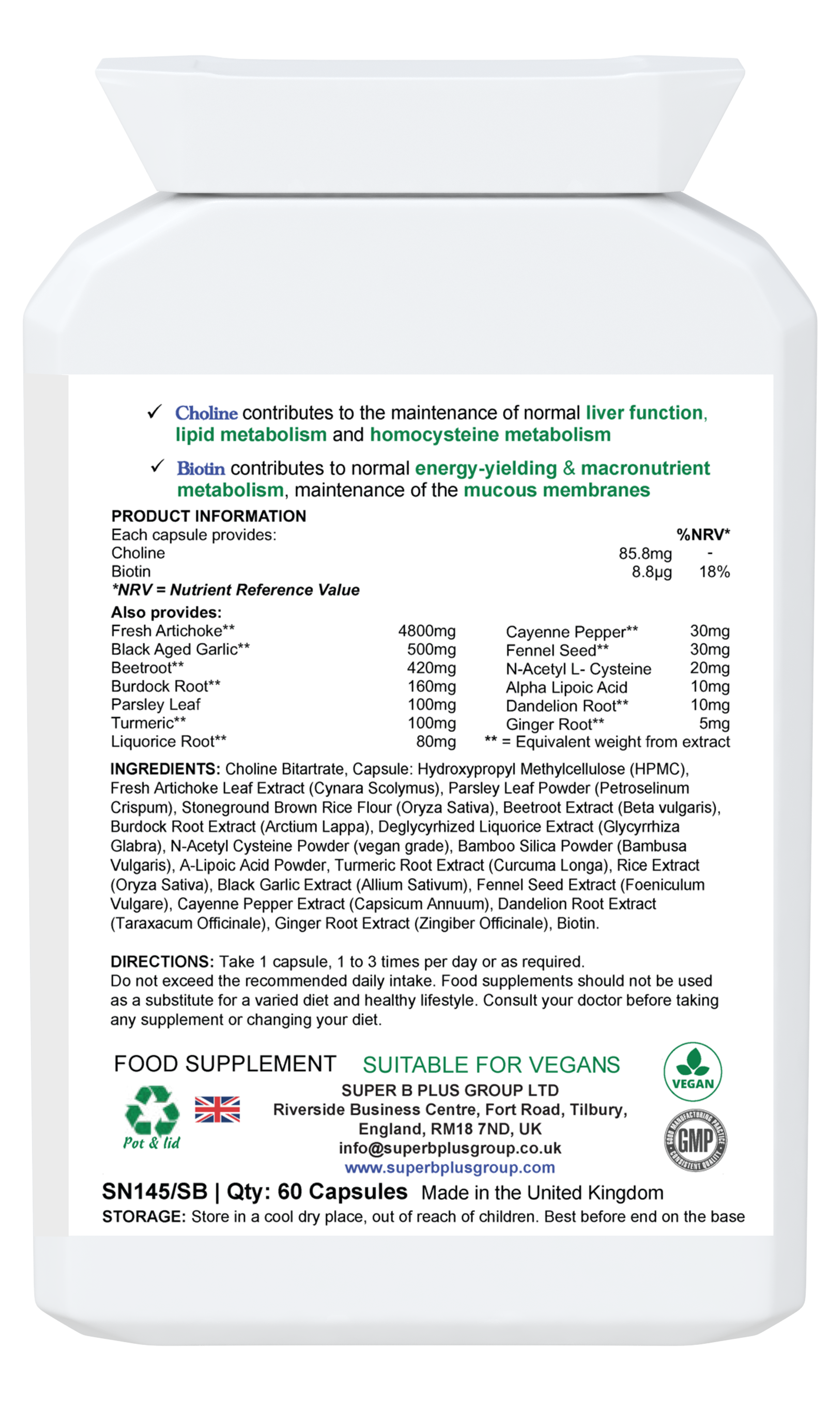 Ingredientes: bitartrato de colina; Cápsula: Hidroxipropilmetilcelulosa (HPMC); extracto de alcachofa; Polvo de hojas de perejil; Agente de carga: Harina de Arroz Integral; extracto de remolacha; extracto de raíz de bardana; Antiaglomerante: estearato de magnesio (fuente vegetal); N-acetil L-cisteína (fuente vegetal, de maíz); Agente Antiaglomerante: Dióxido de Silicio; Ácido alfa lipoico; extracto de raíz de regaliz; Extracto de semilla de hinojo; extracto de cúrcuma; extracto de ajo negro envejecido; Extracto de Cayena en Polvo; extracto de raíz de diente de león; extracto de raíz de jengibre; Biotina Pura.