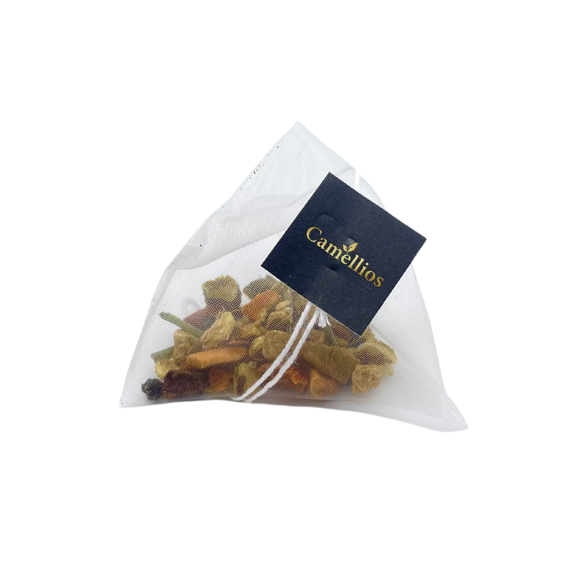 Nuestras bolsitas de té piramidales son biodegradables y están llenas del mejor té de hojas sueltas.