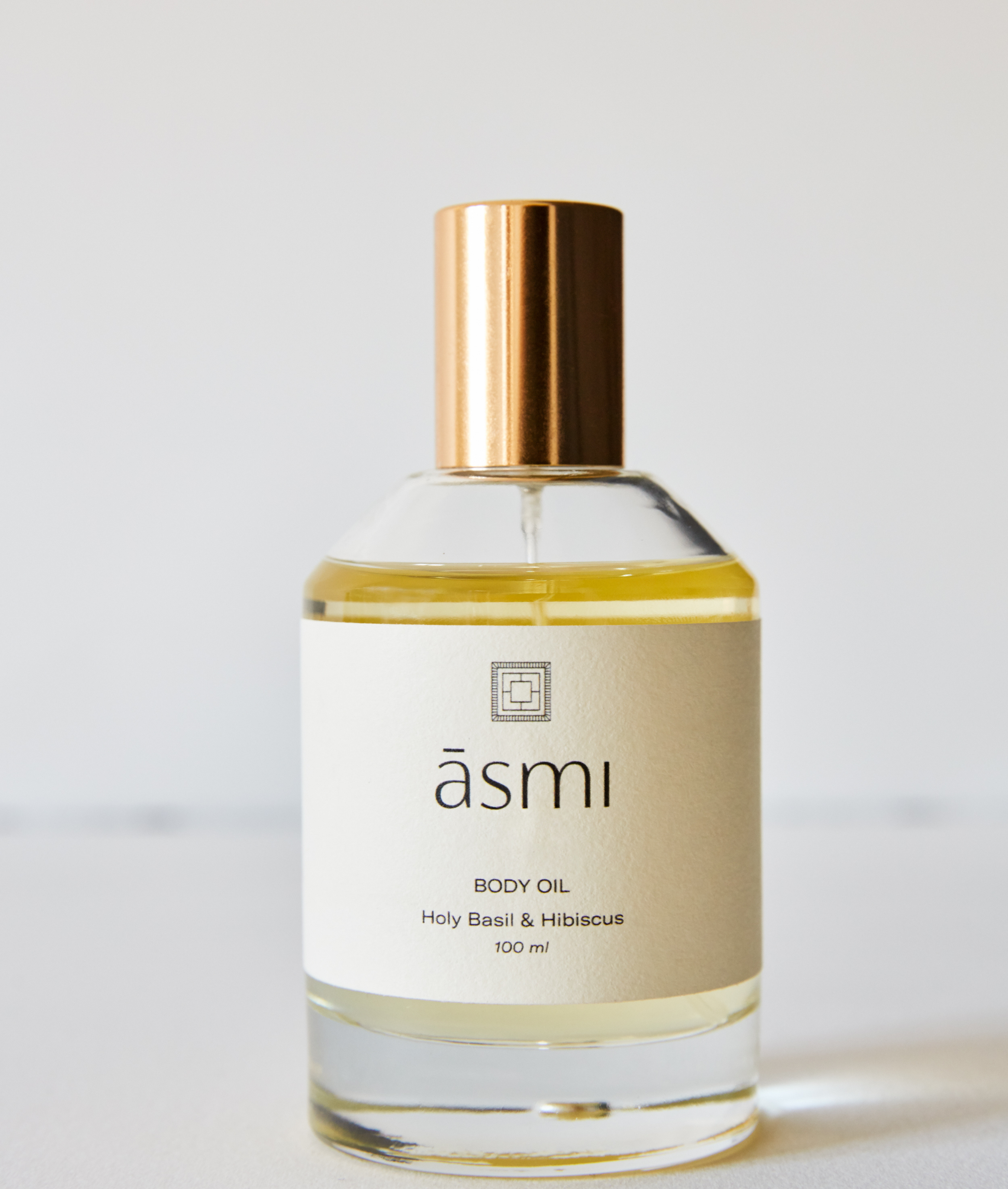 Su aceite está repleto de vitaminas E, A y K restauradoras y nutritivas, derivadas del aceite de sésamo, vetiver y albahaca sagrada (Tulsi). La cúrcuma ayuda a crear un brillo saludable, mientras que el pachulí y el neroli armonizan tu estado de ánimo y equilibran tus sentidos. Su piel estará calmada, suave y rejuvenecida. La albahaca sagrada y el aceite de sésamo ayudan a reparar el daño de la piel e igualan el tono de la piel.