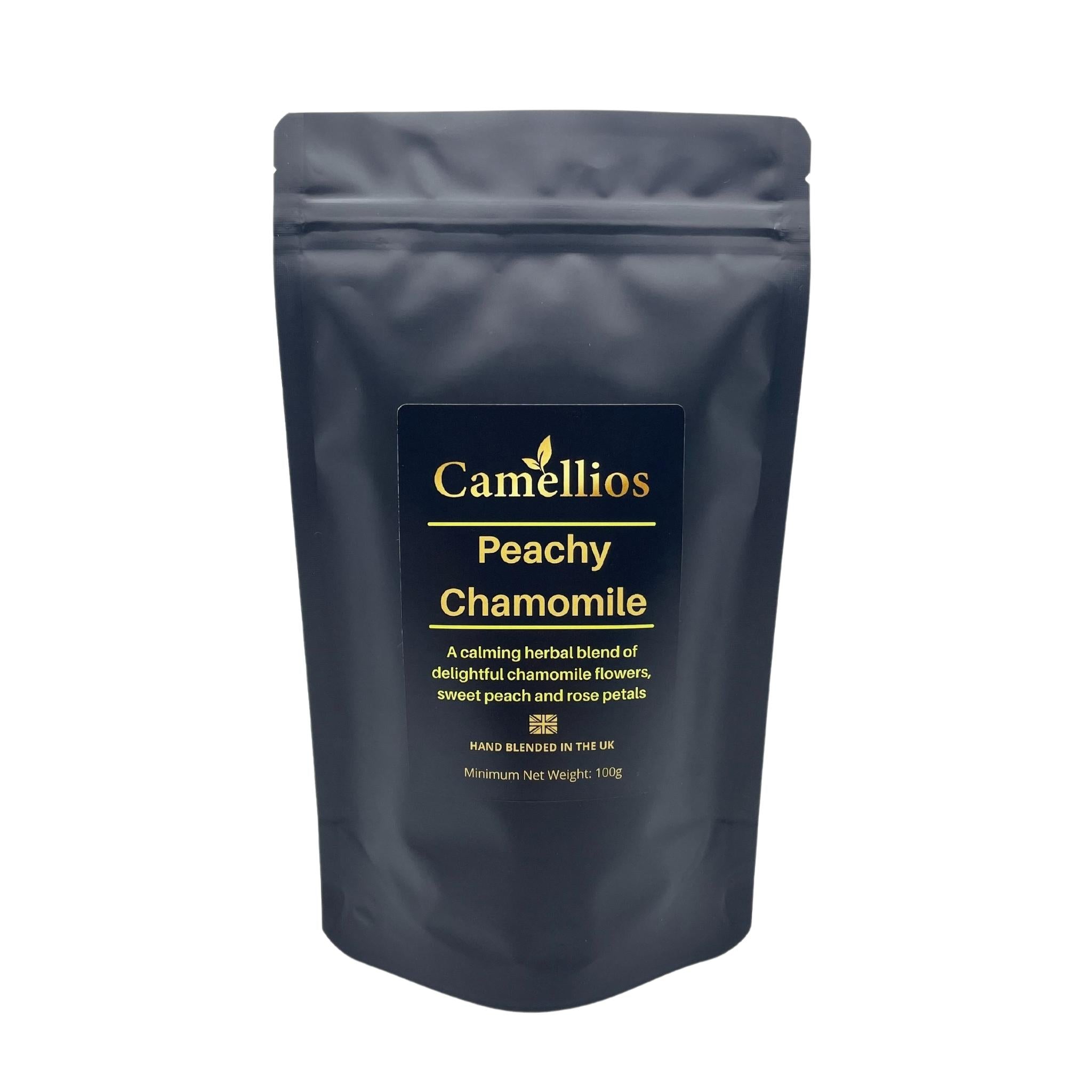 A calming herbal blend of delightful chamomile flowers, sweet peach and rose petals.