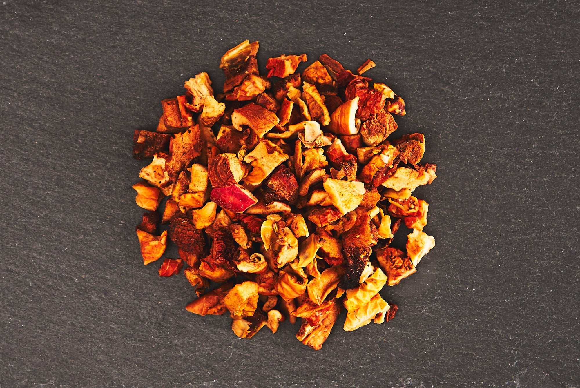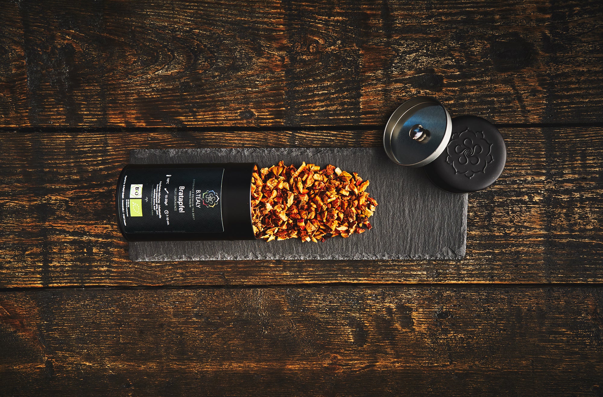 Té de frutas – Experiencia premium de té de frutas ORGÁNICO elaborado con trozos de manzana alemana, canela y anís. Una experiencia a medio camino entre el té y el ponche, perfecta en Navidad cuando afuera hace frío y está oscuro.