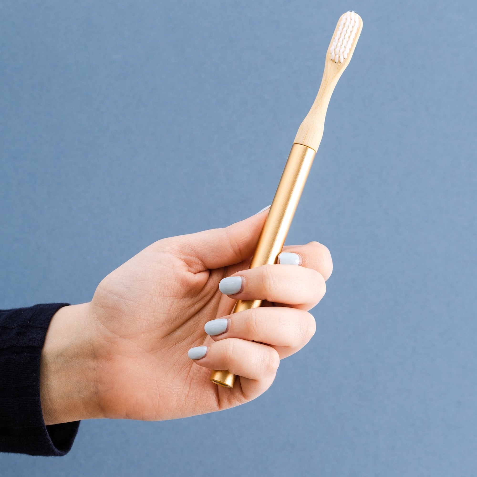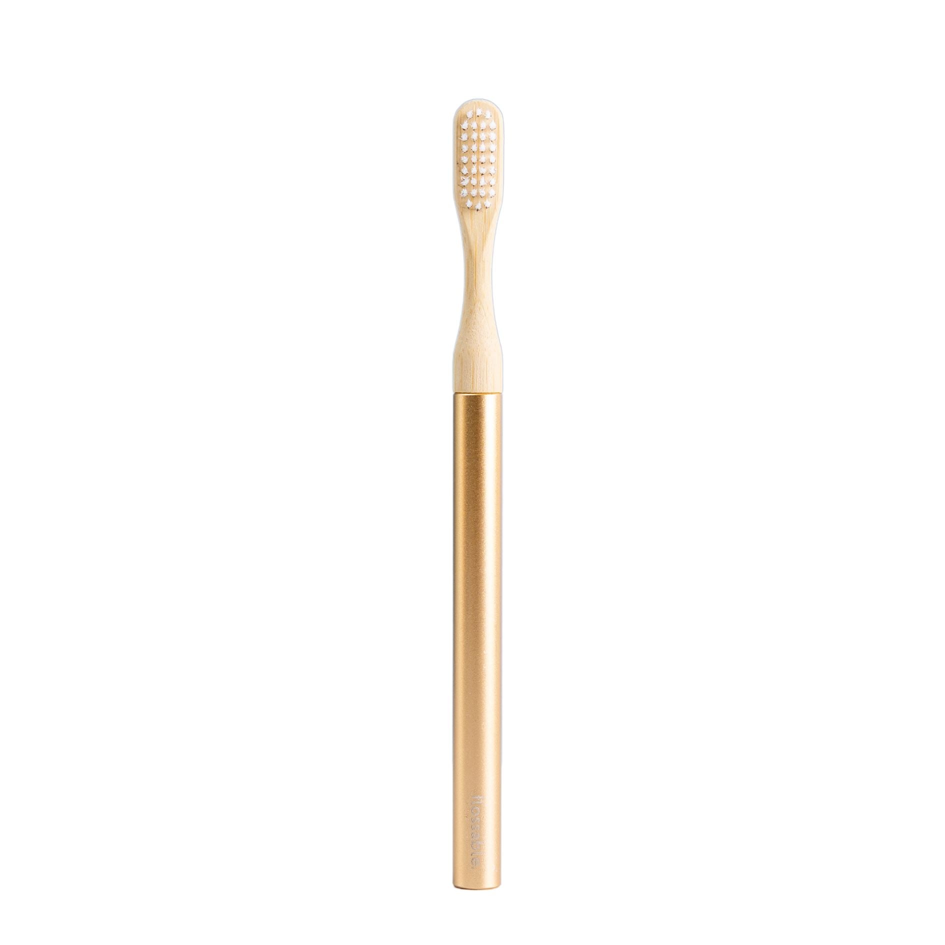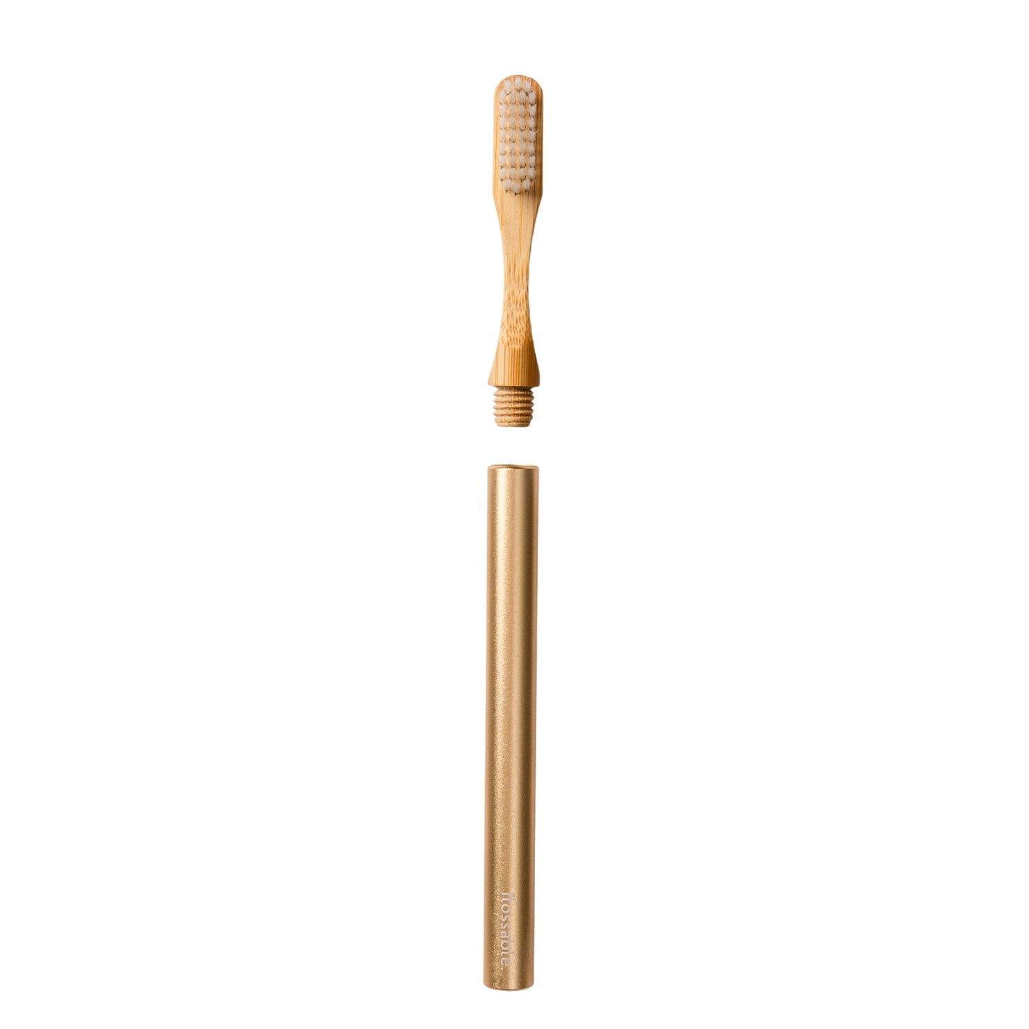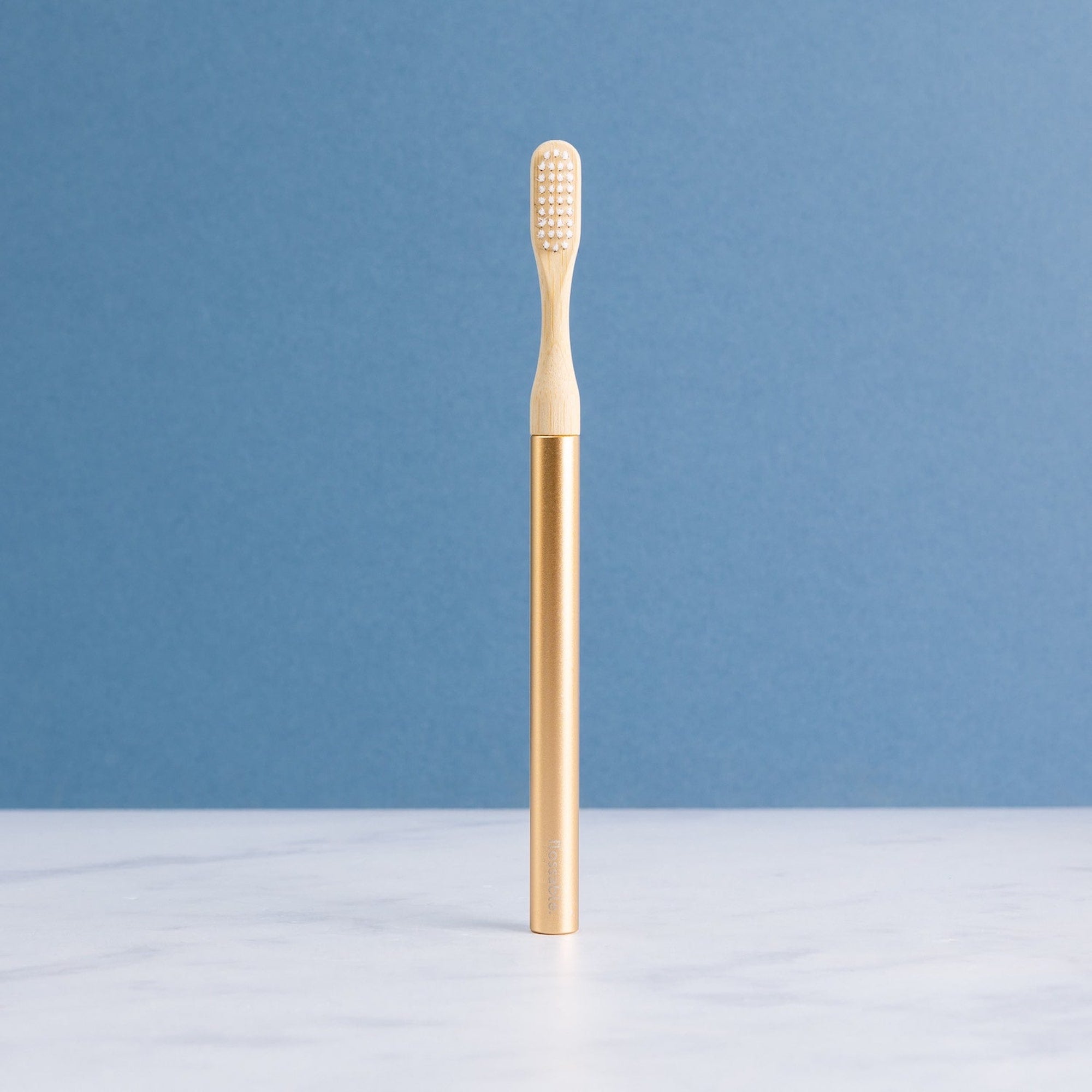 Nuestro Forever Brush es un cepillo de dientes dorado con un mango de aluminio dorado cepillado de primera calidad y cabezales de reemplazo de bambú.