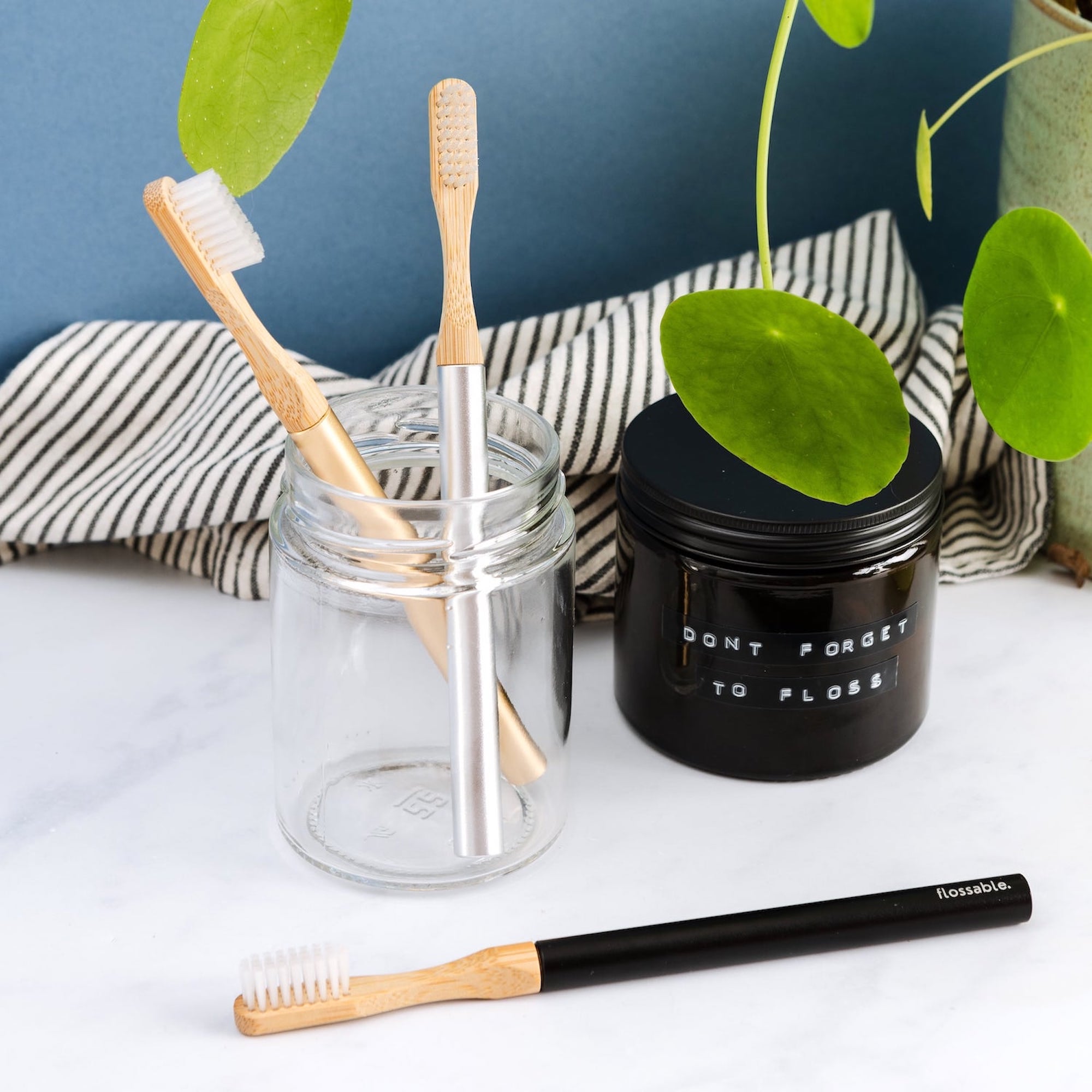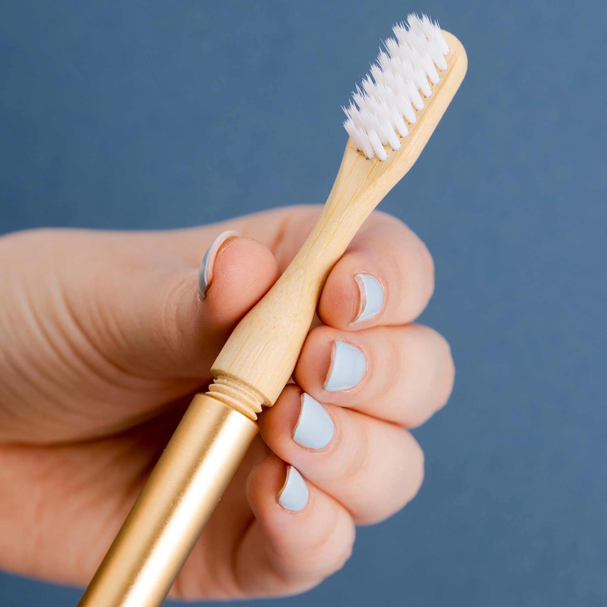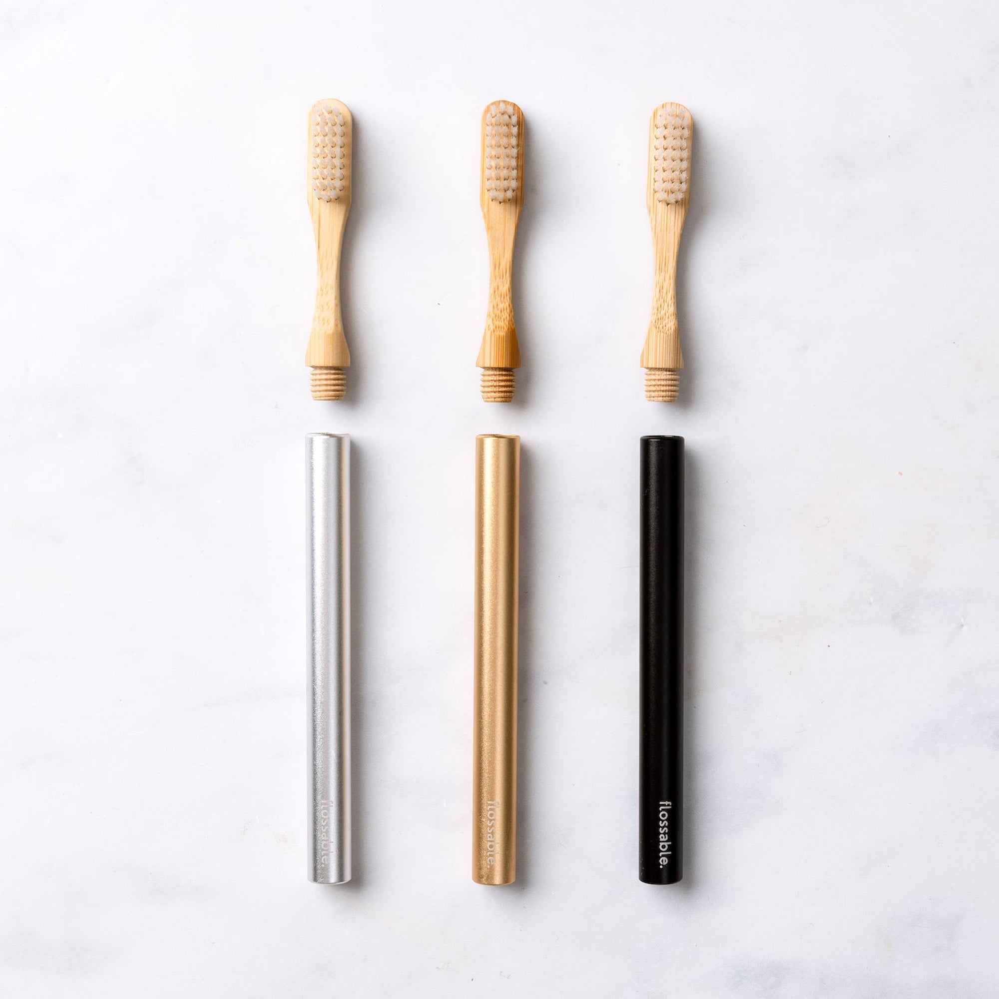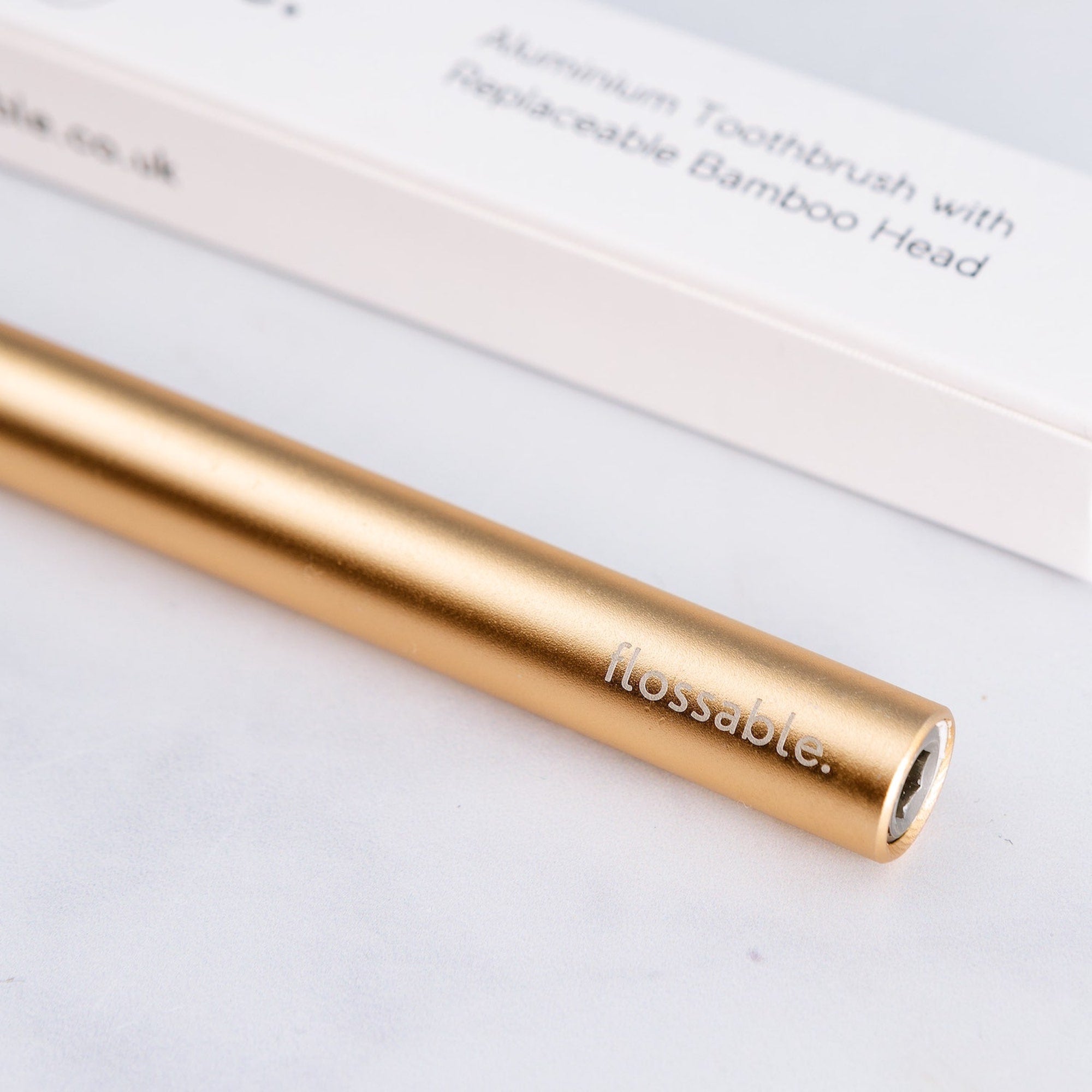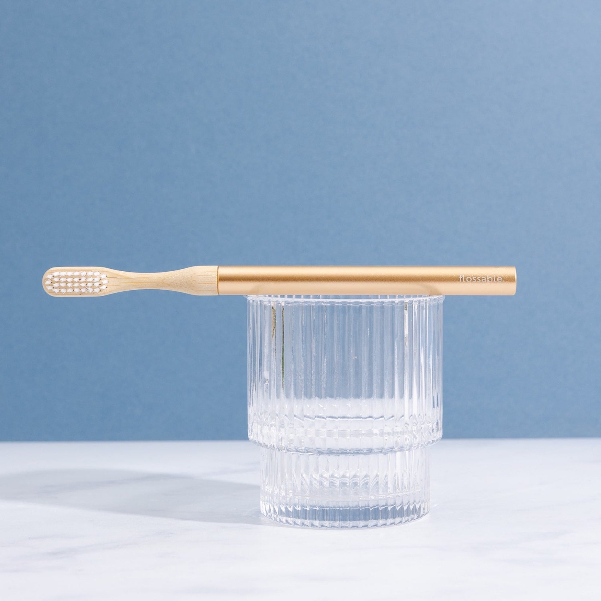 Nuestro Forever Brush es un cepillo de dientes dorado con un mango de aluminio dorado cepillado de primera calidad y cabezales de reemplazo de bambú.